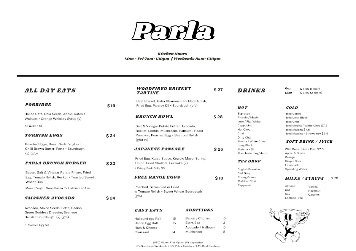 Welcome to Parla, a delightful café nestled in Launceston, Tasmania. Known for its inviting atmosphere and vibrant all-day menu, Parla promises an exceptional dining experience. The highlight of the menu includes their Woodfired Brisket Tartine, featuring juicy beef brisket paired with creamy baba ghanoush, pickled radish, and a fried egg — a feast for the senses at A$27. For brunch lovers, the Brunch Bowl is a must-try, offering a harmonious blend of salt and vinegar potato fritters, halloumi, and poached egg, drizzled with beetroot relish for A$28.